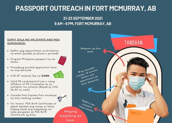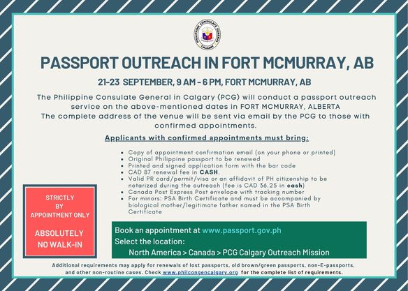 The Philippine Consulate General in Calgary (PCG) will conduct a passport outreach service on the above-mentioned dates in FORT MCMURRAY, AB